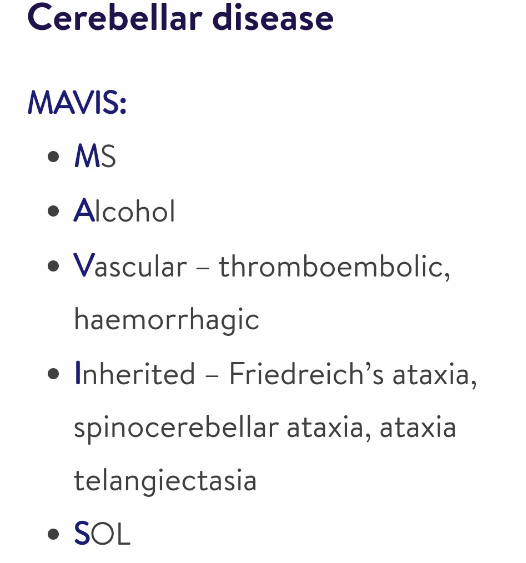 hemisphere lesions: intention tremor, past pointing, dysdiadokinesis, nystagmus