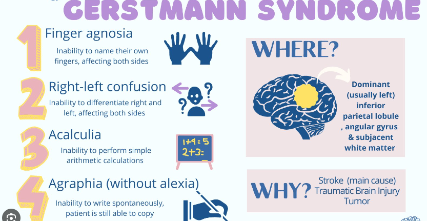 Gerstmann’s syndrome (lesion of dominant parietal): alexia, acalculia, finger agnosia and right-left disorientation