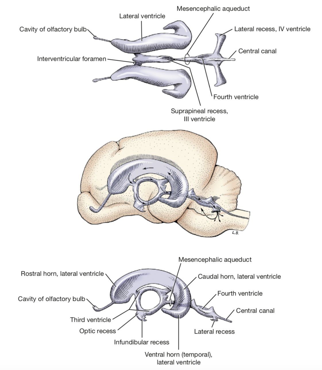 From lateral ventricles, through interventricular foramina, through 3rd ventricle and mesencephalic aqueduct to fourth ventricle into subarachnoid space and bilateral recesses and apertures as well as a small amount into the central canal.