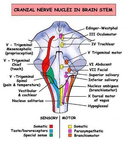 BASIC NEUROANATOMY AND NEUROPHYSIOLOGY: List the cranial nerve nuclei in each constituent of the brainstem
