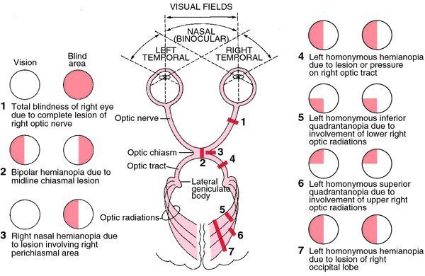 BASIC NEUROANATOMY AND NEUROPHYSIOLOGY: Name the location of the causative lesion in; Homonymous hemianopia; Homonymous quadrantanopia; Bitemporal hemianopia; Monocular visual field defect