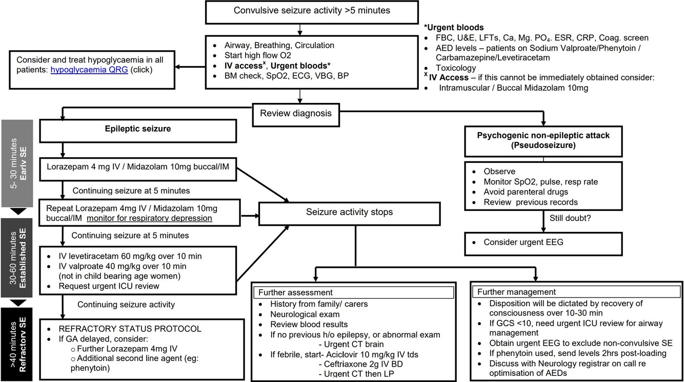 Status epilepticus: A convulsive seizure lasting for 5 minutes in duration or recurrent seizures with no recovery in between (?3 seizures in 1 hour).