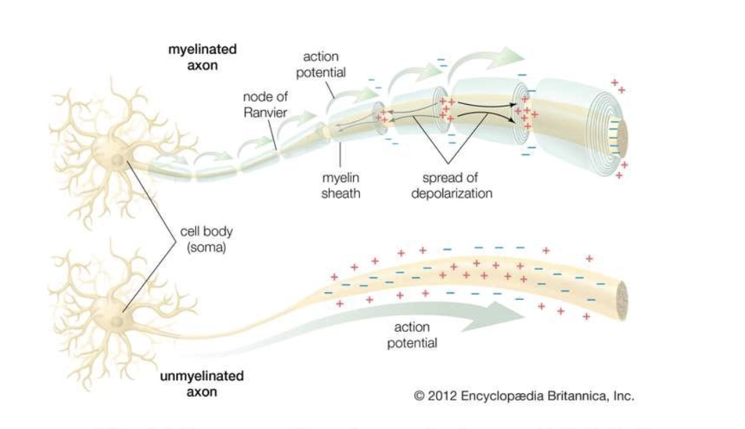 - when there are myelin sheaths insulators the conduction is faster, and ions are concentrated between sheaths, acts as an accelerator