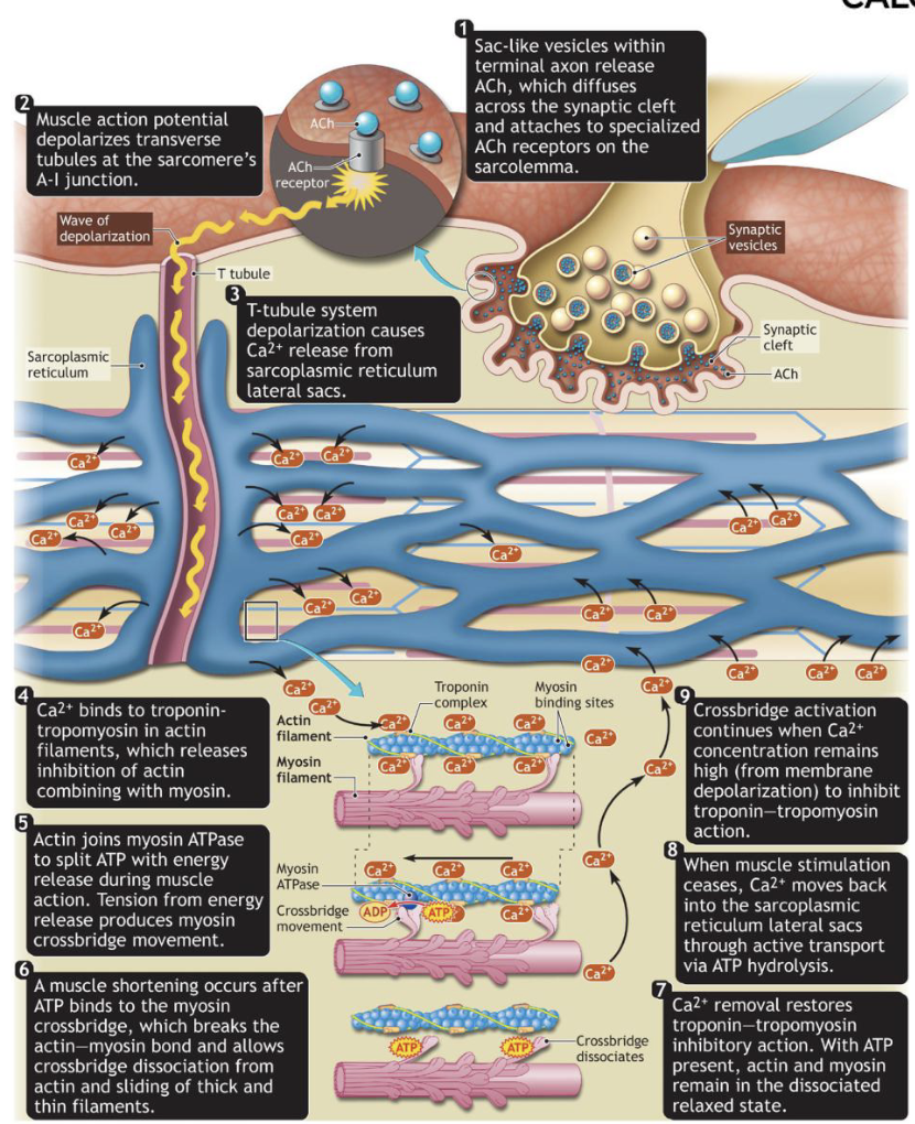 Ca binds to troponin, moves tropomyosin, myosin head binds to actin