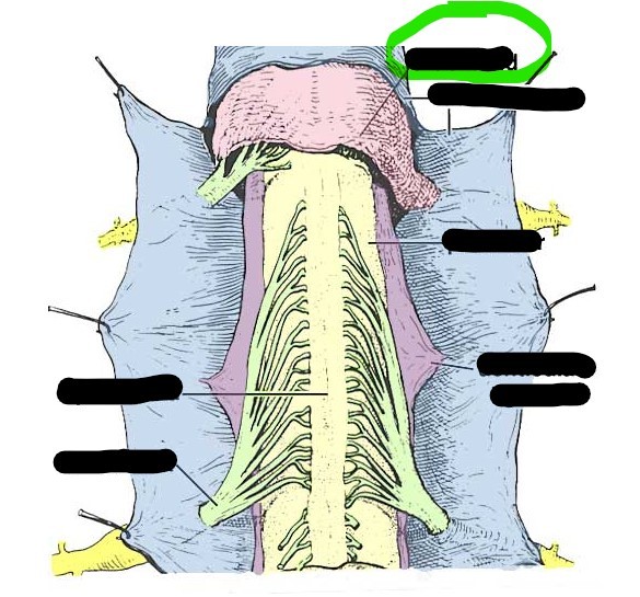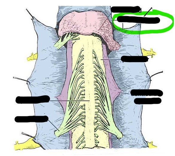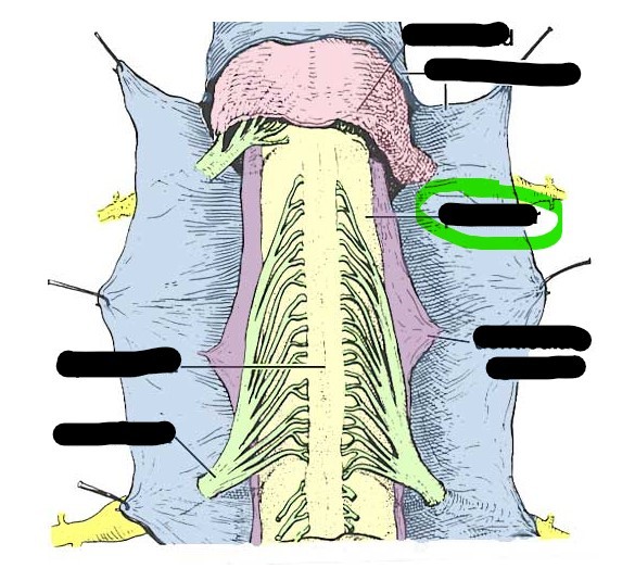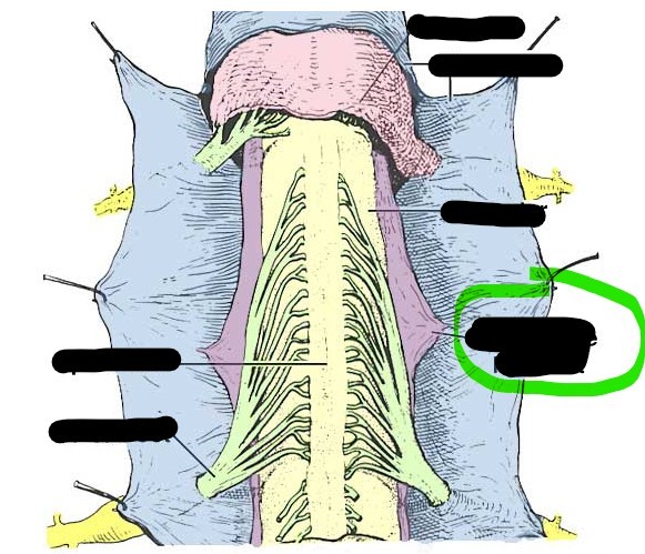 paired, lateral triangular extensions of the spinal pia mater that attach tot he dura mater; help suspend and anchor the spinal cord laterally to dura mater
