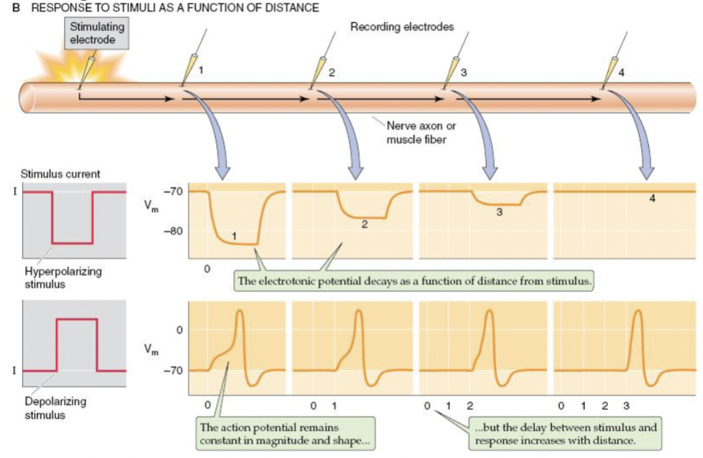 Subthreshold potentials (graded potentials( that spread for short distances along cell membranes. Receptor potentials are generated during the transduction of sensory stimuli and postsynaptic potentials are generated by the opening of agonist-activated channels.