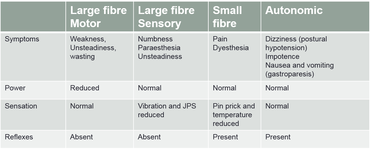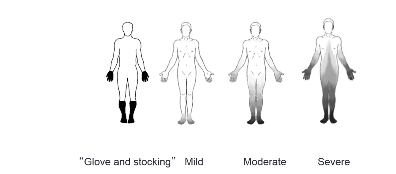 This is a disorder of peripheral or cranial nerves, whose distribution is usually symmetrical and widespread, often with distal weakness and sensory loss (glove and stocking pattern)
