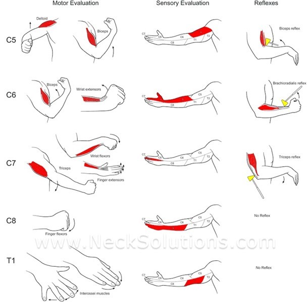 Radiculopathy = irritation of or injury to a nerve root (as from being compressed) that typically causes pain, numbness, or weakness in the part of the body which is supplied with nerves from that root.