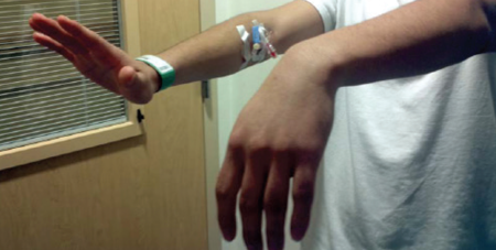 Bilateral Foot drop - due to the patient not being able to dorsiflex, causing the toes to scrape the ground while walking, requiring someone to lift the leg higher than normal