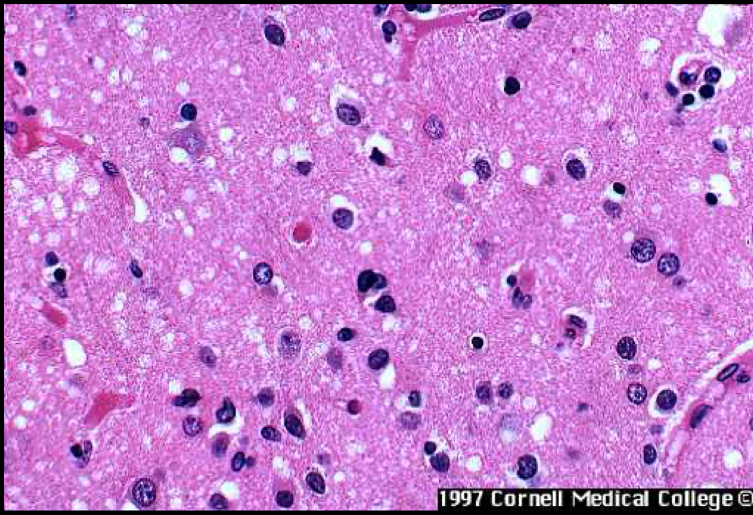 Inflammation of the parenchyma (not the meninges) in the brain - affects neuronal cell bodies