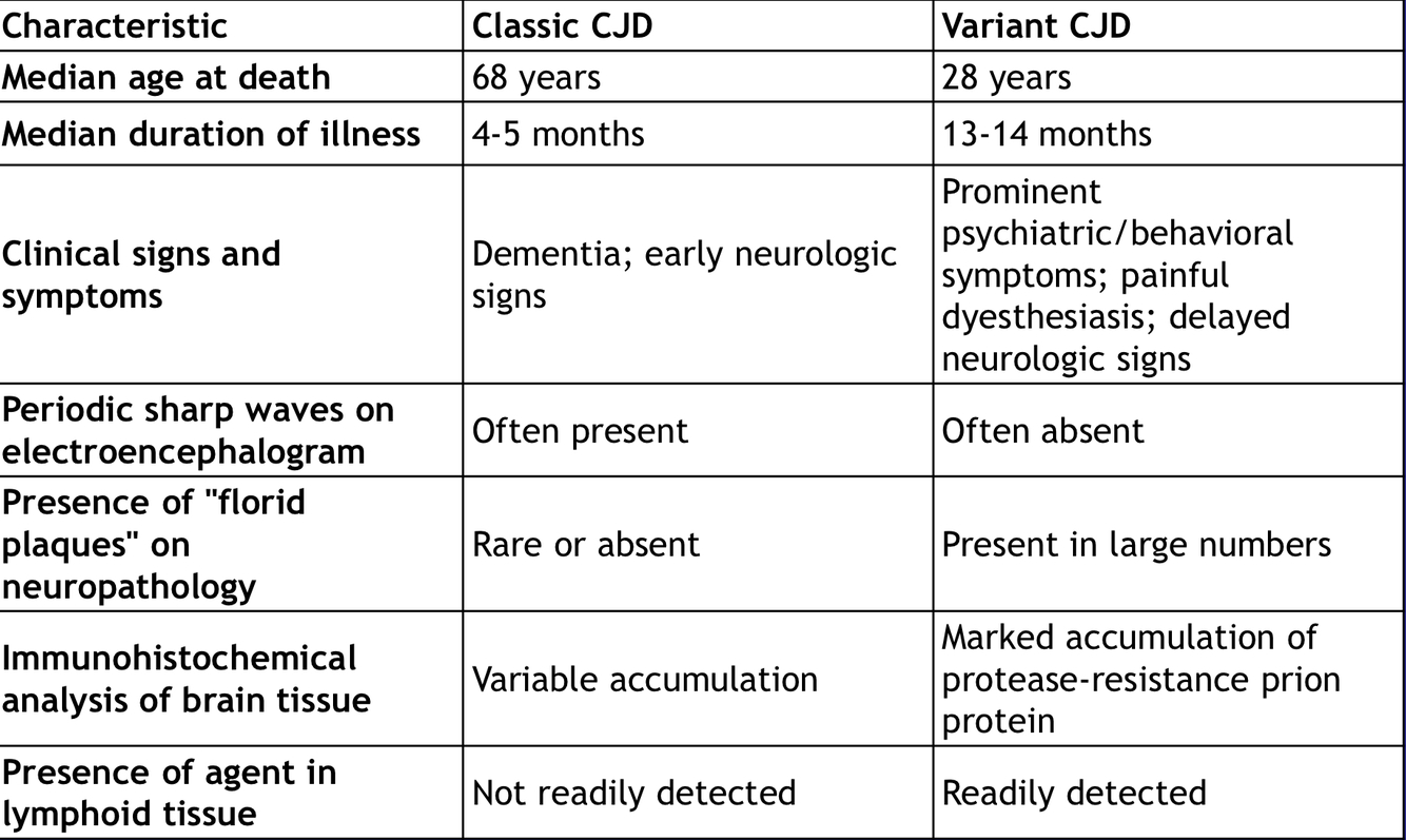 There are 2 forms of vCJD, classic and variant. What are the different clinical features of each?