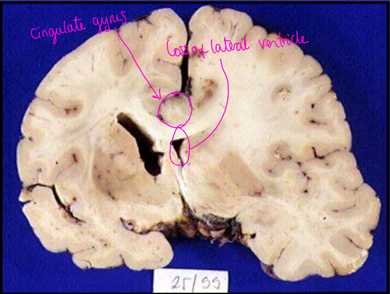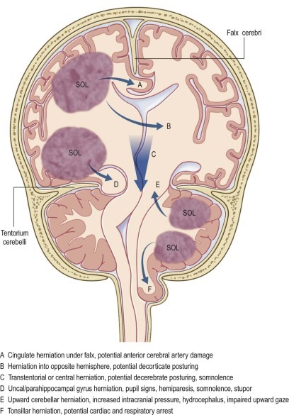 If ICP raises too much it will cause herniation. What are the different types of herniation?