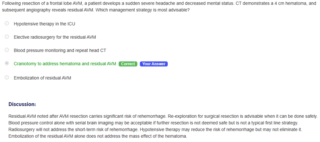 subsequent angiography reveals residual AVM. Which management strategy is most advisable?