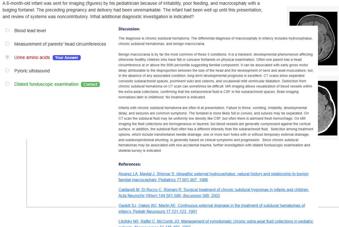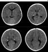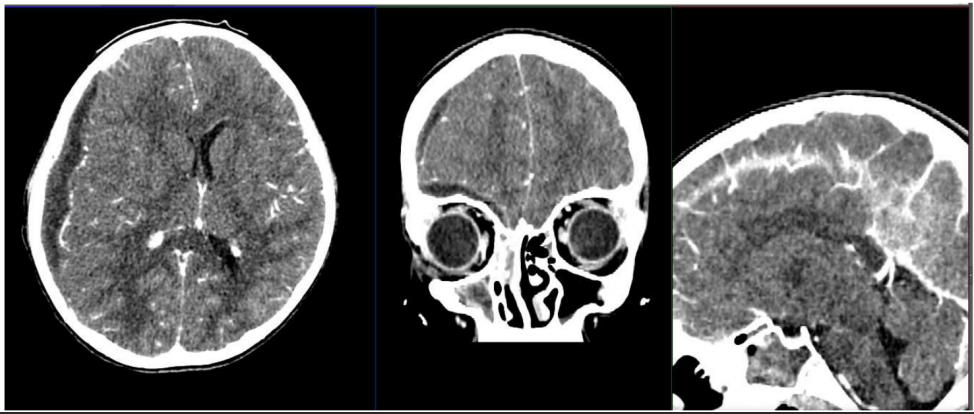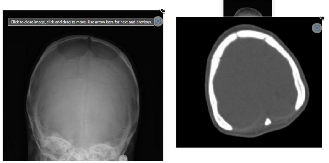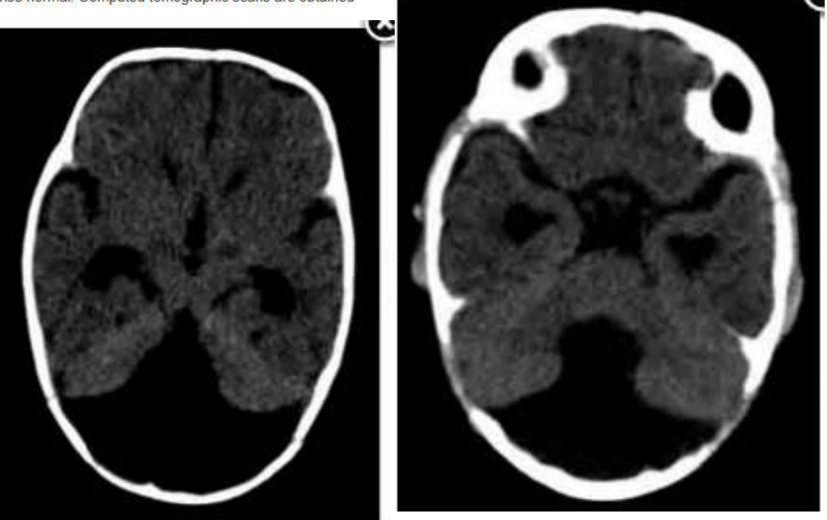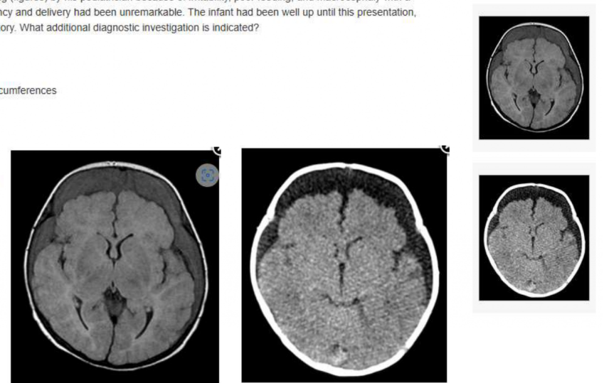 A 8-month-old infant was sent for imaging (figures) by his pediatrician because of irritability, poor feeding, and macrocephaly with a