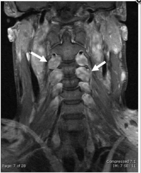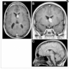 A 14-year-old female presents with progressive difficulty writing. An MRI (figure) shows multiple nodular areas