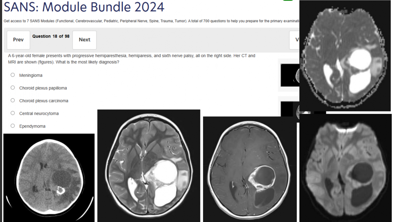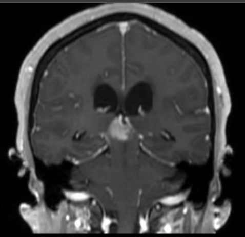 A 6-year-old female presents with progressive hemiparesthesia, hemiparesis, and sixth nerve palsy, all on the right side. Her CT and