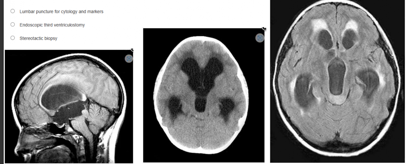 A 6-month-old infant presents with enlarging head circumference, full anterior fontanelle, splitting of the cranial sutures and developmental delay. The results of a neurological examination are otherwise normal. Computed tomographic scans are obtained