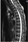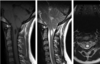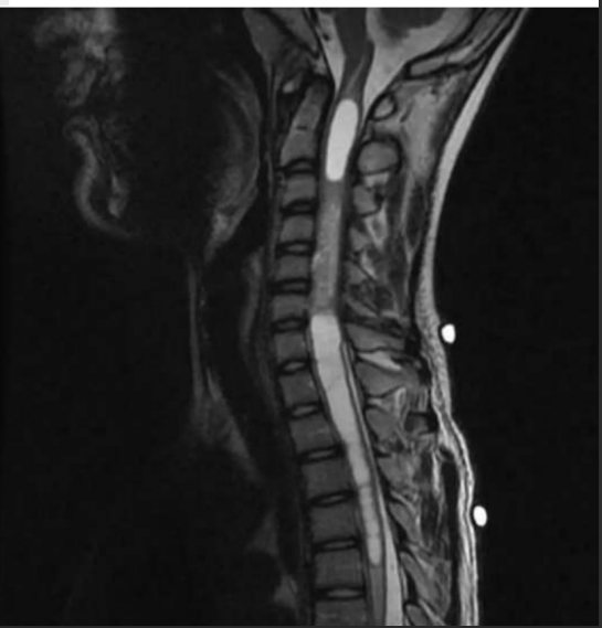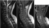 intact. Diagnostic work-up included an MRI of the cervical and thoracic spine (figure). What is the most