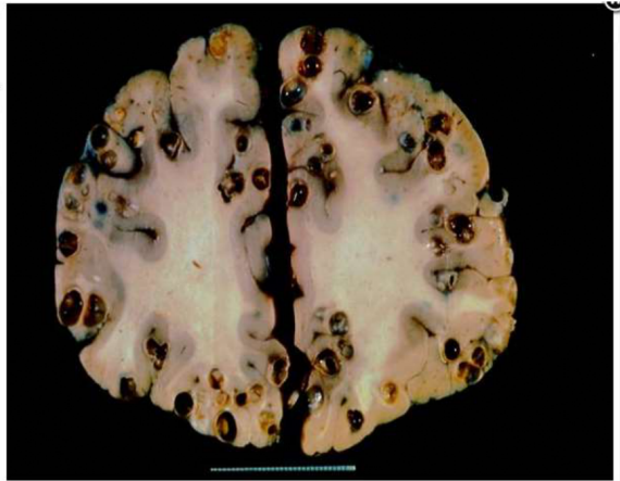 demonstrates rim-enhancing cysts throughout the brain. What is the most likely etiology?