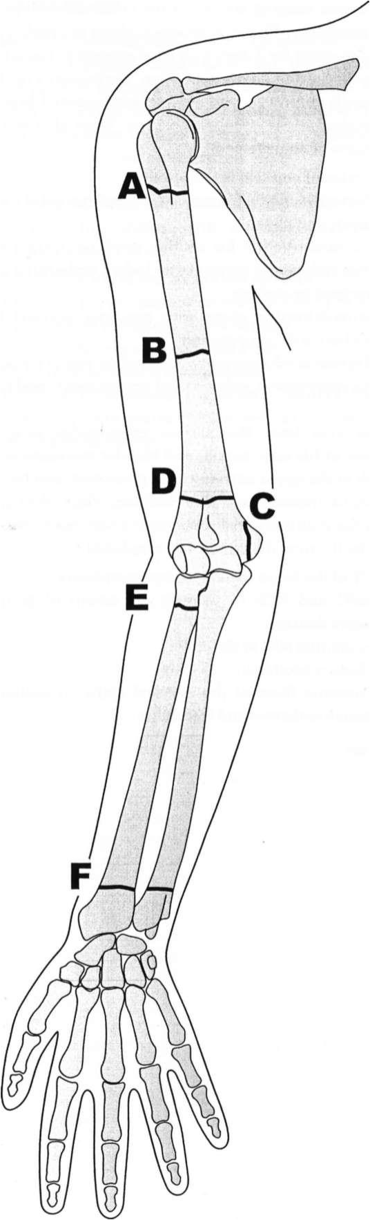 nerve (G5-6), which innervates the teres minor and deltoid muscles. This can result in sensory loss at the shoulder as well as shoulder abduction weakness. There is also a chance of concomitant brachial plexus injury with such a fracture due to the proximity of the proximal humerus to the brachial plexus. The radial nerve runs down the posterior aspect of the arm and is at risk for injury during fractures of the midhumeral shaft as it winds around the spiral groove (B). This could cause paralysis of the wrist and hand extensor muscles. Since the fibers that innervate the triceps muscle often arise proximal to the spiral groove, extension of the forearm may not be affected by midhumeral fractures, and some supination is possible due to an intact biceps brachii muscle. Fracture in the vicinity of the medial epicondyle may result in ulnar nerve damage only (C), which can produce weakness of flexion and adduction of wrist, paralysis of hypothenar muscles and most deep muscles of the hand, as well as some weakness in select thenar muscles. Injury of the ulnar nerve by fracture of the distal ulna can result inweakness or paralysis of hypothenar, some thenar, and intrinsic hand muscles but often spares innervation of the wrist (flexion, adduction), since these nerves often arise more proximally. If there is also a concomitant distal radial fracture, injury to the median nerve may accompany the ulnar nerve injury (F) and produce loss of sensation of the lateral side of the palm without sensory loss on the palmar sides of the first, second, and third digits (superficial branch of the median nerve) as well as marked weakness of thumbflexion and abduction, inability to oppose the thumb, inability to fully extend the second and third digits, and sensory loss along the palmar side of the first, second, and third digits (deep branch in carpal tunnel). A fracture of the distal humerus (D) is most likely to result in combined radial,median, and ulnar nerve injuries