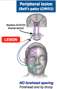 Lower motor neuron of CN VII causing forehead and lip droop