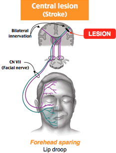 Lip droop with forehead SPARING due to bilateral innervation