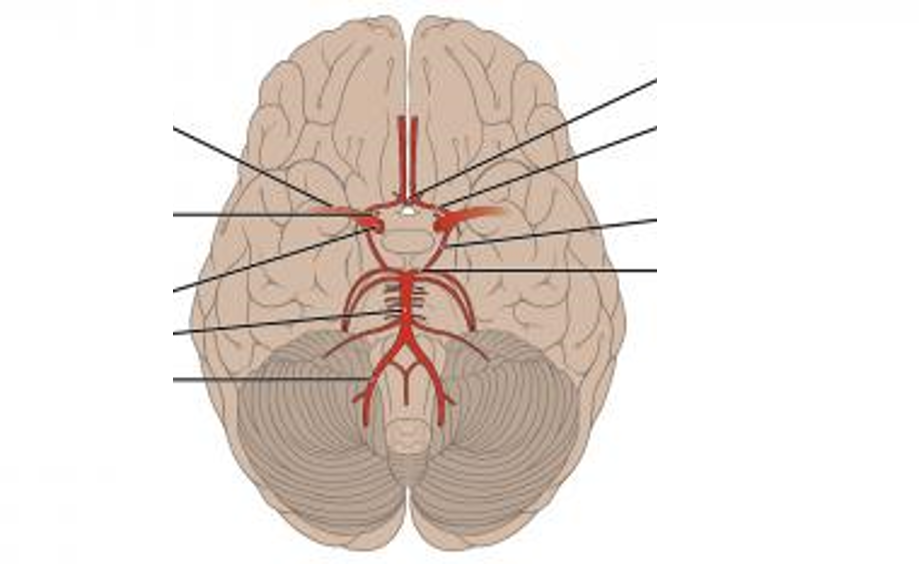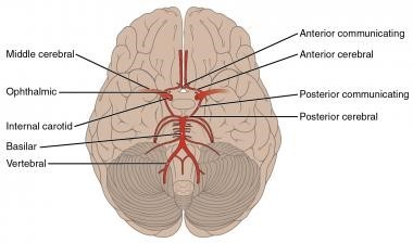 1 - middle cerebral 2 - ophthalmic 3 - internal carotid 4 - basilar 5 - vertebral 6 - posterior cerebral 7 - posterior communicating 8 - anterior cerebral 9 - anterior communicating