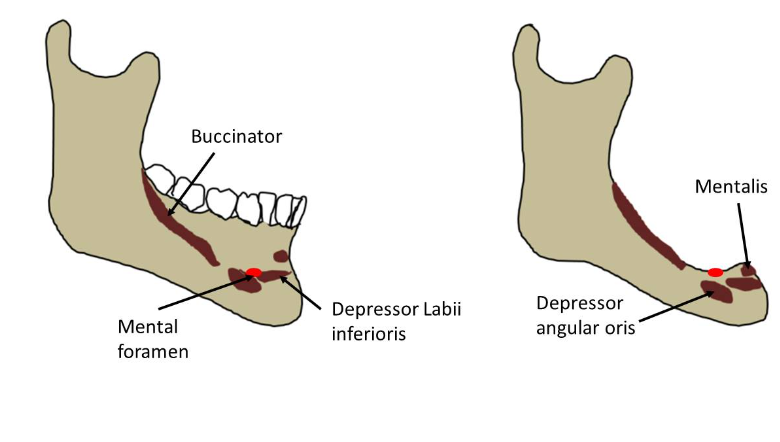 insertion of the circum-oral musculature come to light superficially to the denture bearing area