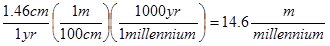 The Atlantic ocean basin is widening at a rate of about 1.46cm/yr. Convert this rate to m/millennium. A millennium is 1000 years.