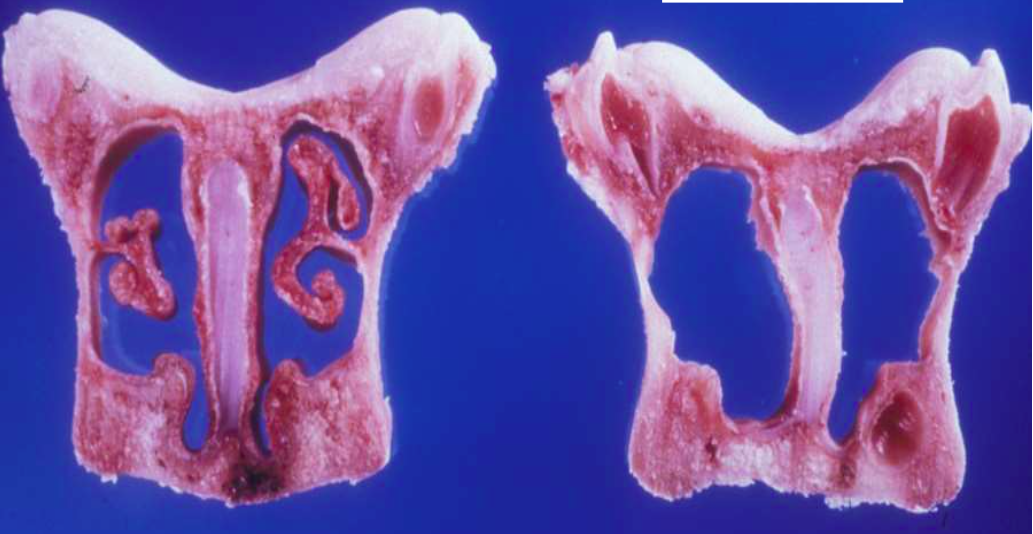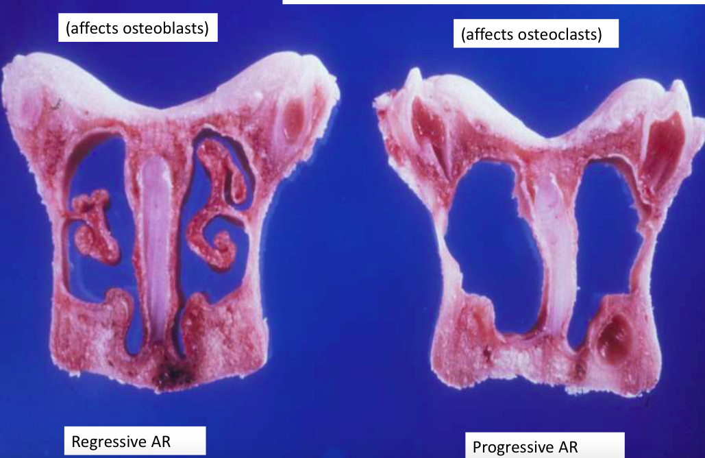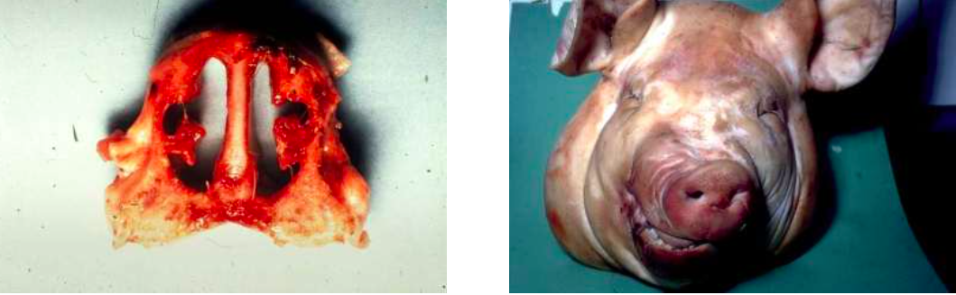 On the left: you have B. bronchiseptica producing DNT this affects the osteoblasts and produces regressive atrophic rhinitis.