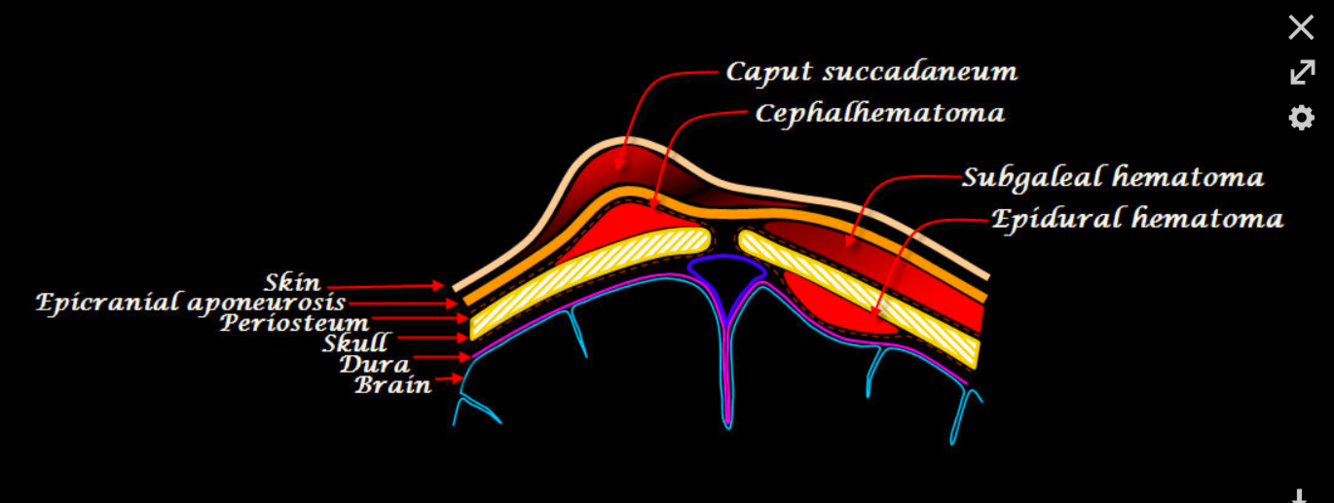 Cephalohematoma-does not cros midline, resolves on own