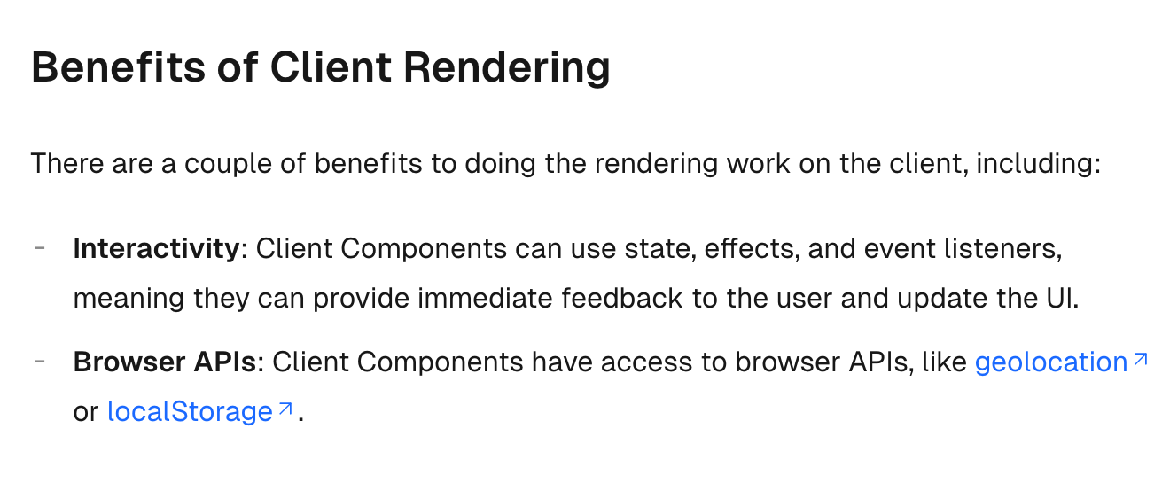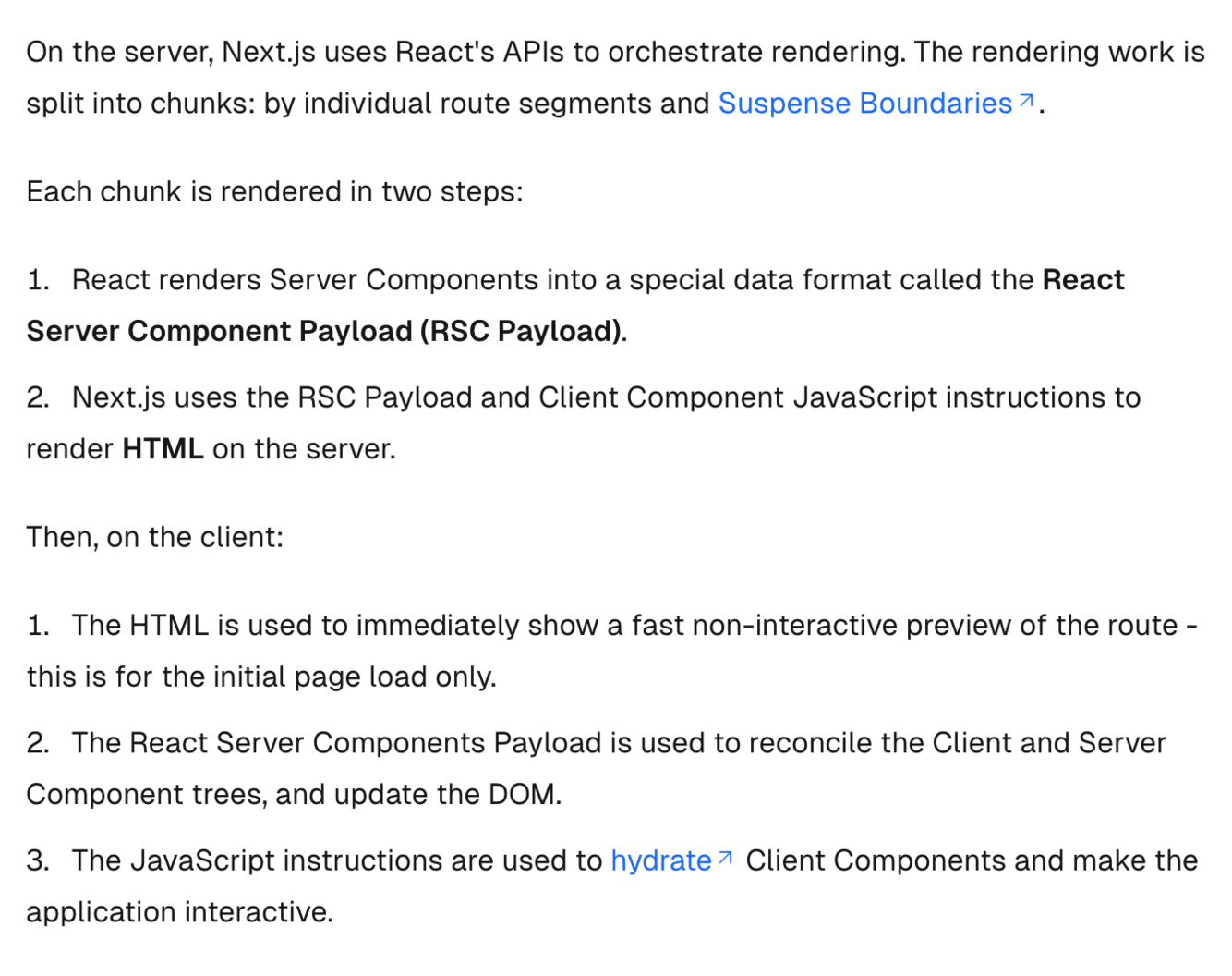 To optimize the initial page load, Next.js will use React’s APIs to render a static HTML preview on the server for both Client and Server Components. This means, when the user first visits your application, they will see the content of the page immediately, without having to wait for the client to download, parse, and execute the Client Component JavaScript bundle.