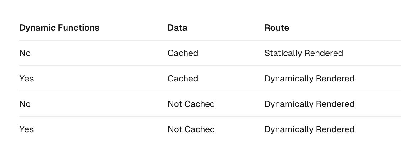 In the table above, for a route to be fully static, all data must be cached. However, you can have a dynamically rendered route that uses both cached and uncached data fetches.