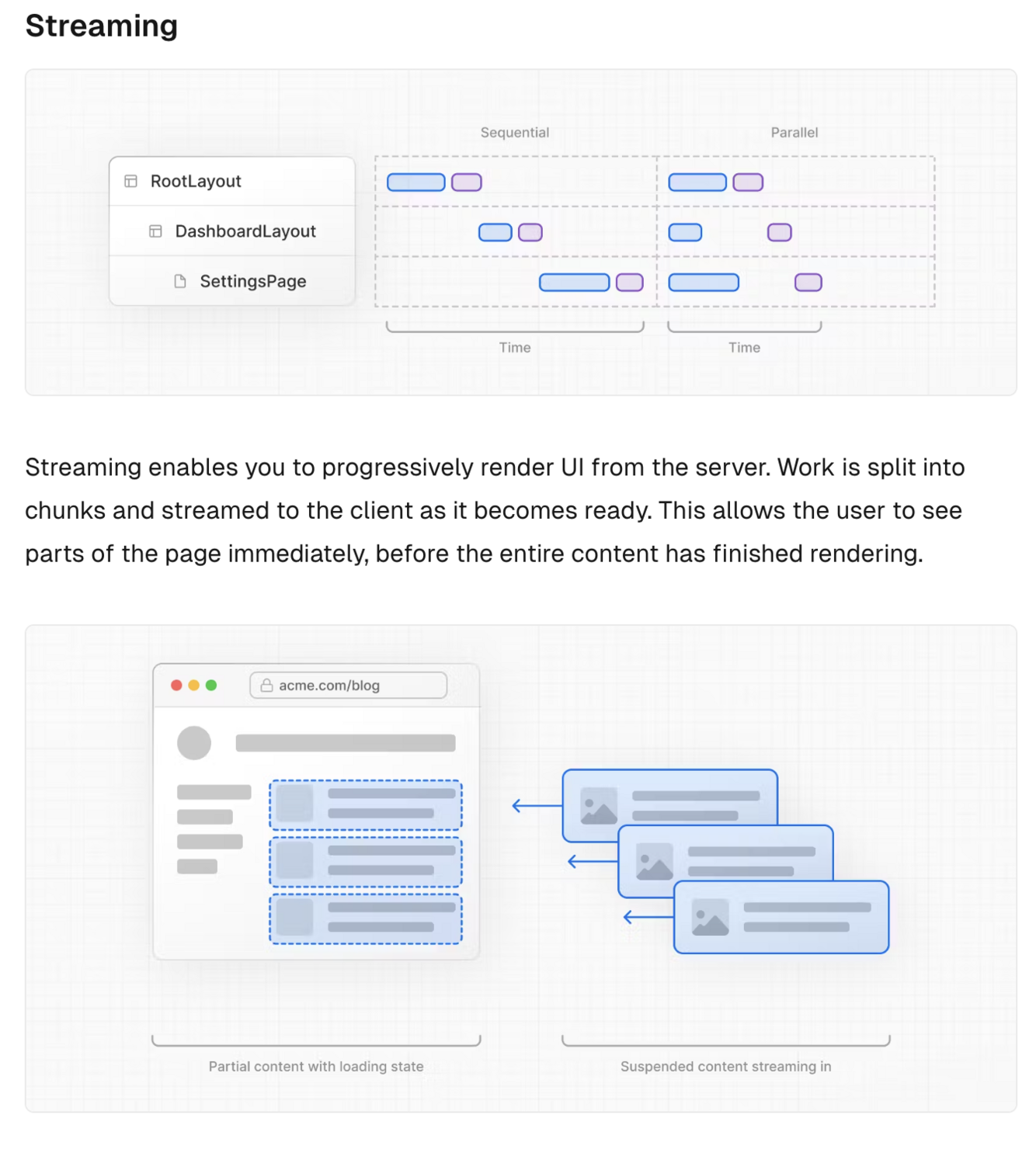 Streaming enables you to progressively render UI from the server. Work is split into chunks and streamed to the client as it becomes ready. This allows the user to see parts of the page immediately, before the entire content has finished rendering.