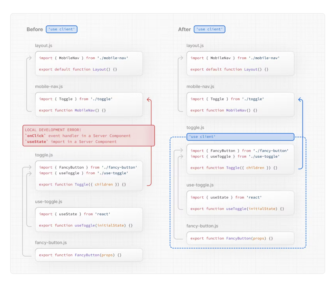The diagram below shows that using onClick and useState in a nested component (toggle.js) will cause an error if the “use client” directive is not defined. This is because, by default, all components in the App Router are Server Components where these APIs are not available. By defining the “use client” directive in toggle.js, you can tell React to enter the client boundary where these APIs are available.