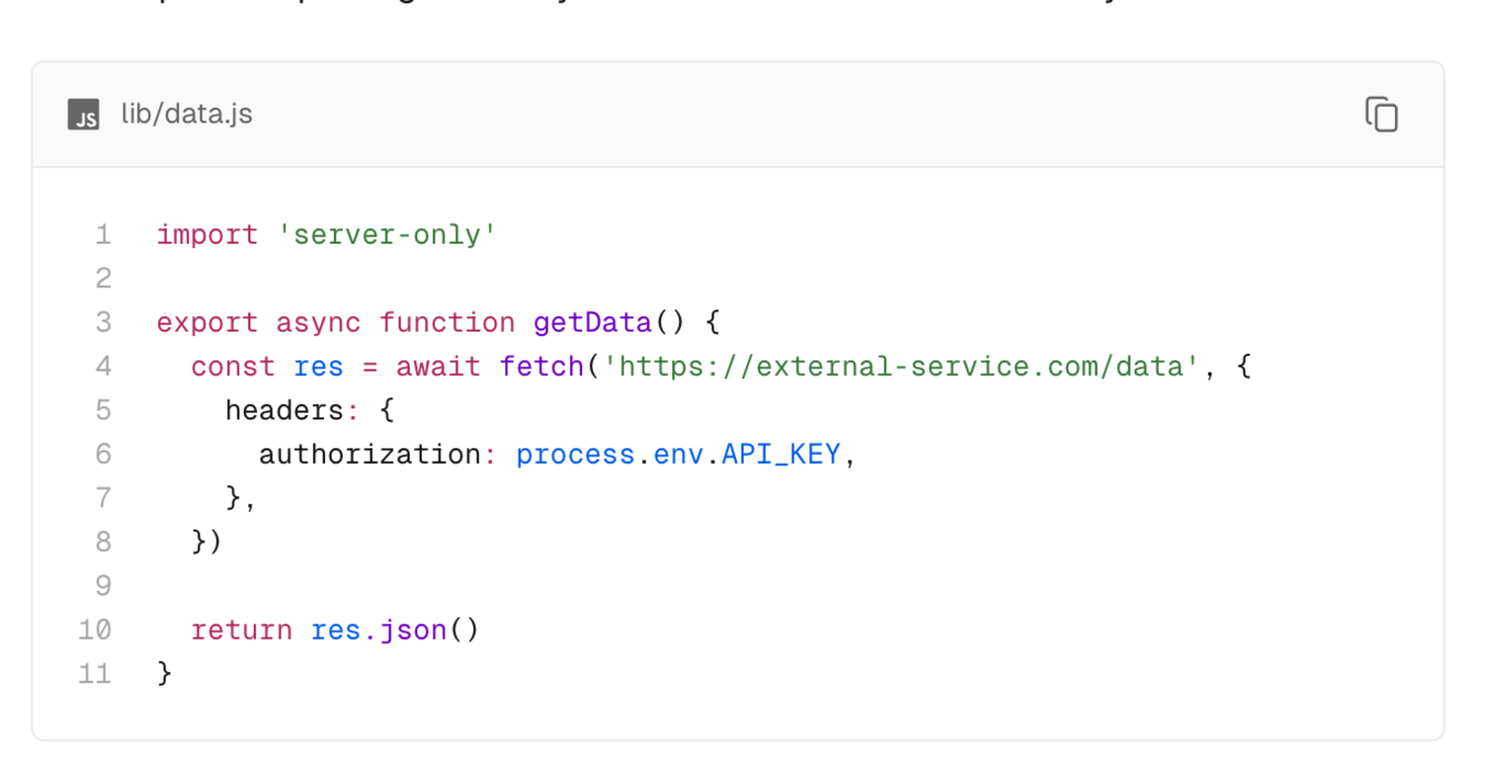 Now, any Client Component that imports getData() will receive a build-time error explaining that this module can only be used on the server.