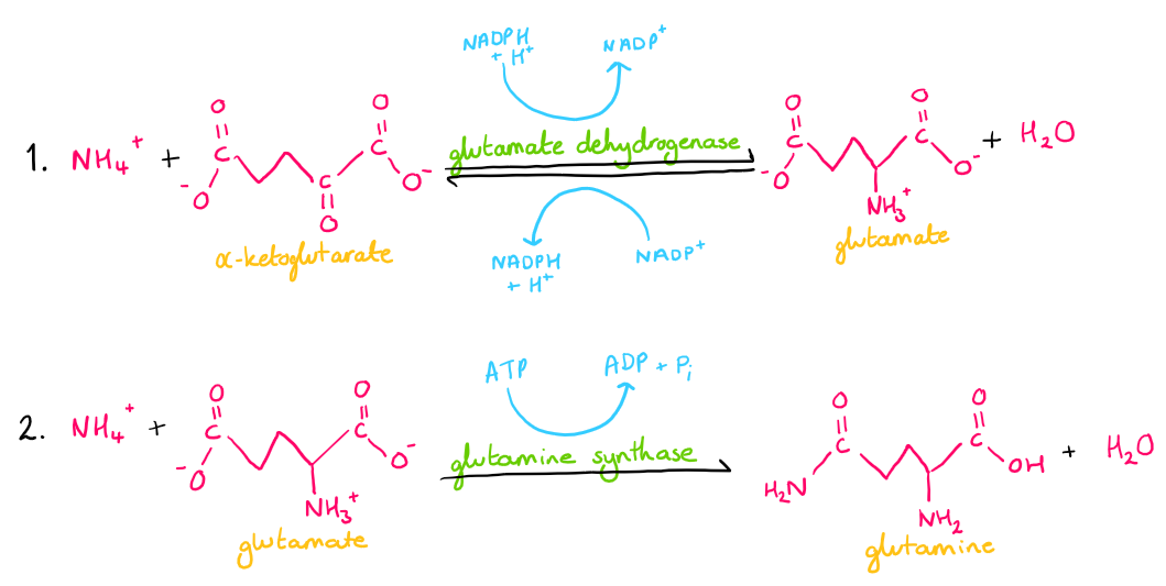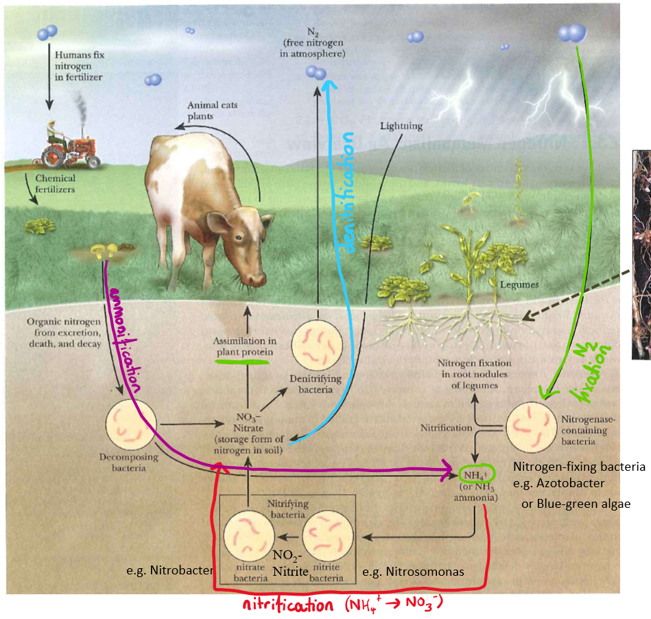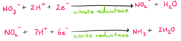 reduction NO3- + NO2- to NH3 in bac in soil/in plants as required for building blocks make aas