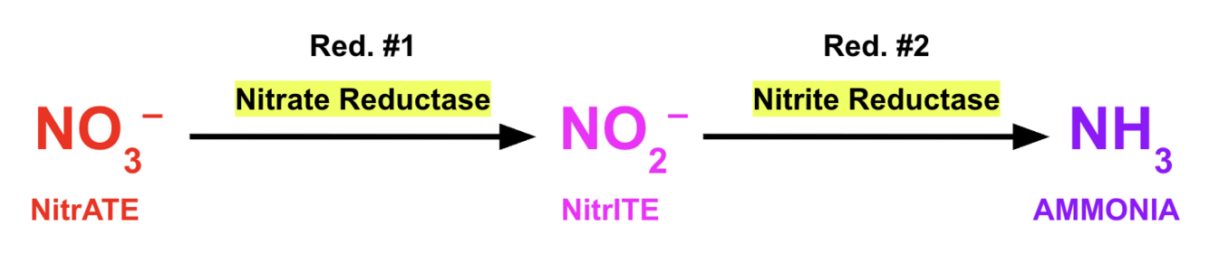 Red. 2) Nitrite ———> Ammonia (via nitrite reductase
