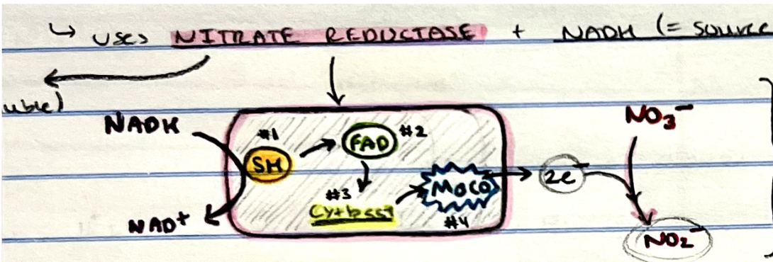 5) Reduced Mo-Co donates TWO electrons to nitrate (NO3-)! == nitrite(NO2-)