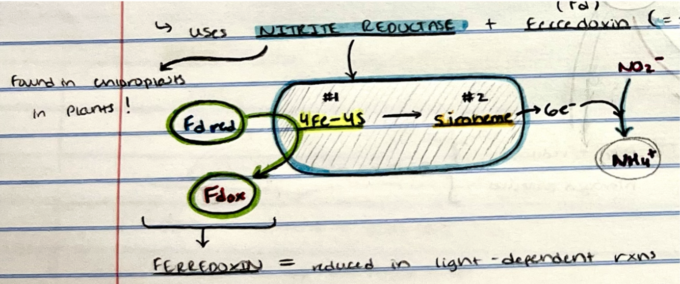 3) Reduced Siroheme donates SIX electrons to nitrite (NO2-) == generate ammonia (NH3)