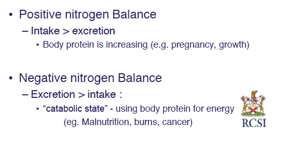 in a ‘catabolic state’ when we’re using our body protein for energy (malnutrition, burns, cancer)