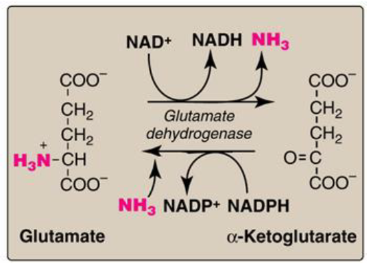 oxidative deamination of glutamate by glutamate dehydrogenase releases an alpha-ketoglutare to be recycled and generates free amonia
