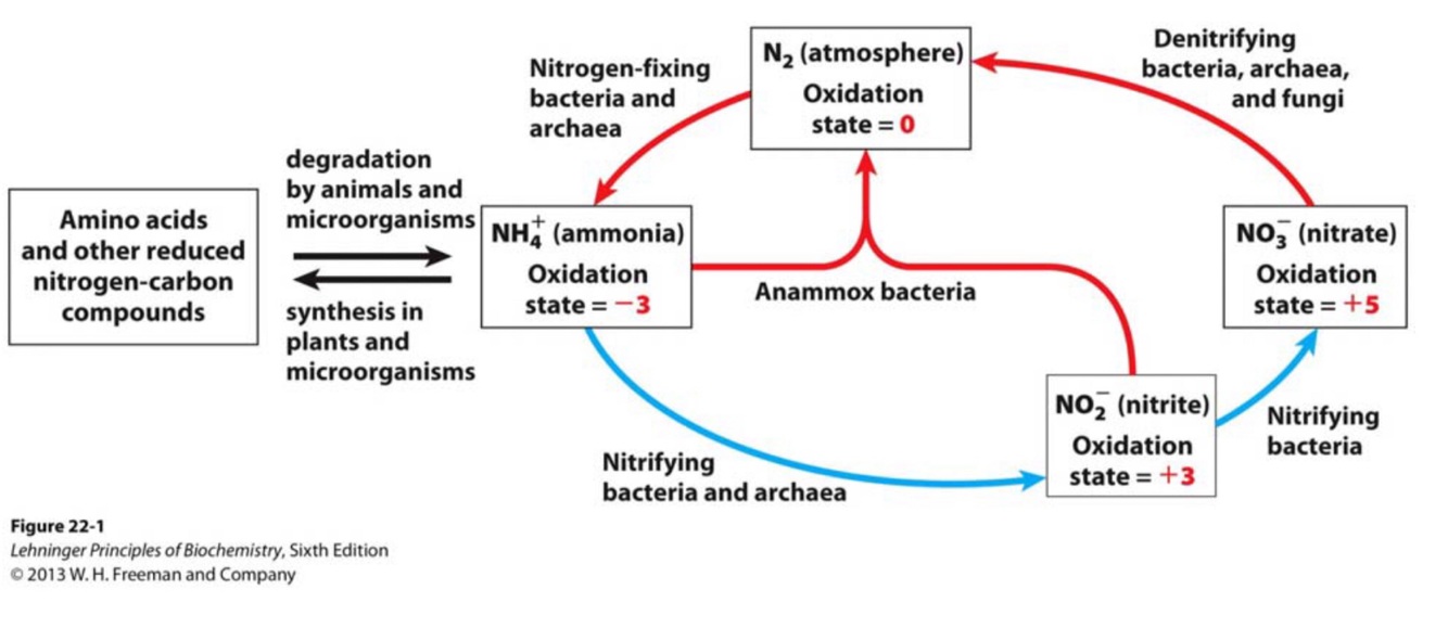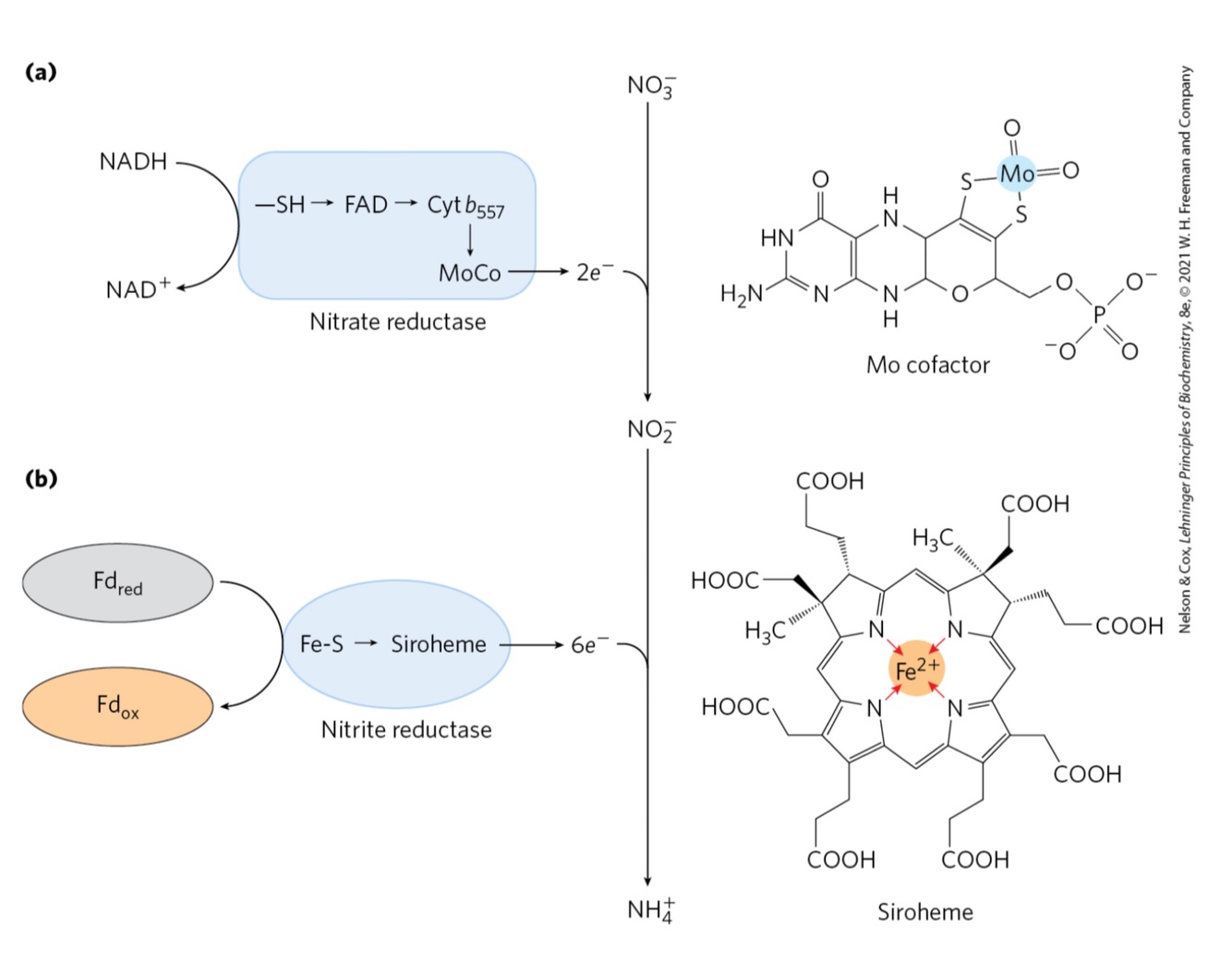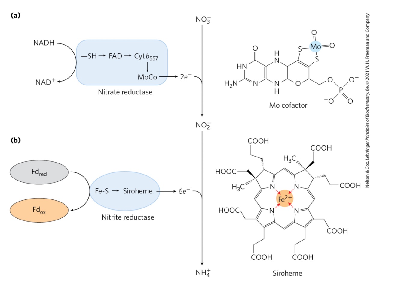 – in plants, electrons pass from ferredoxin through a 4Fe- 4S center to a novel hemelike molecule (siroheme) before reducing NO2−