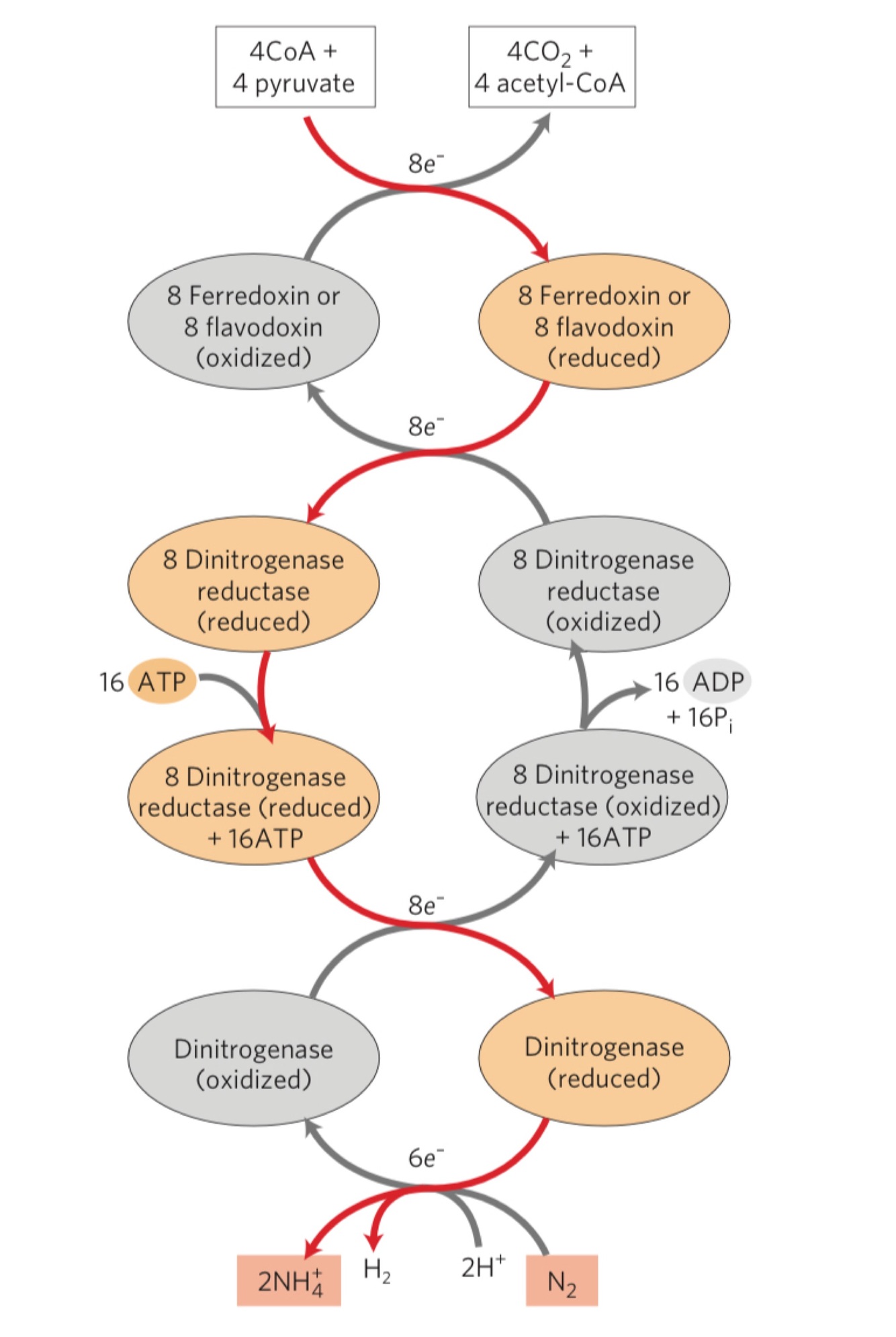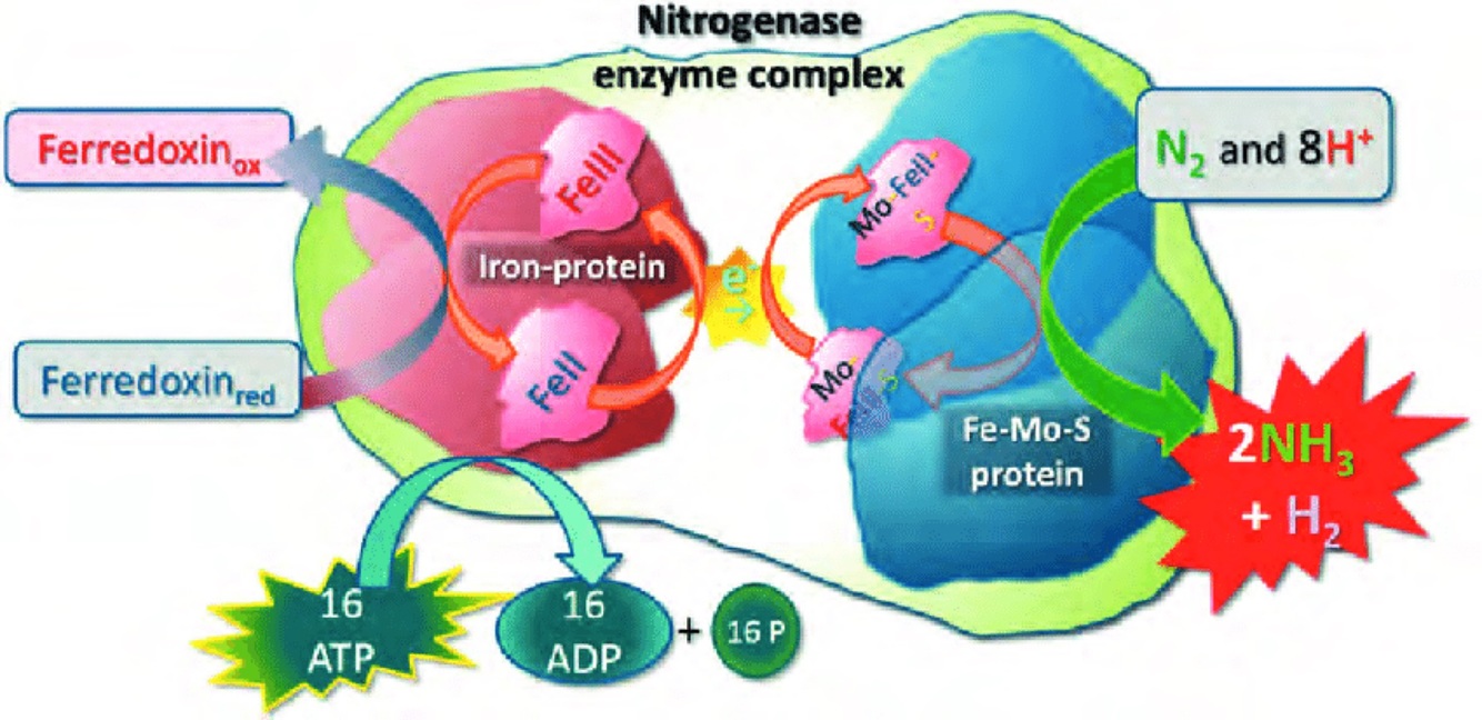 N2 + 10H+ + 8e- + 16ATP —> 2NH4+ 16 ADP + 16 Pi