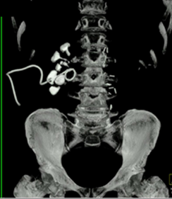 Samlingssystemet med uttalad hydronefros, uttalad hydrouretär ned till konkrement i övergång mellan proximal uretär och mellersta delen ureätär