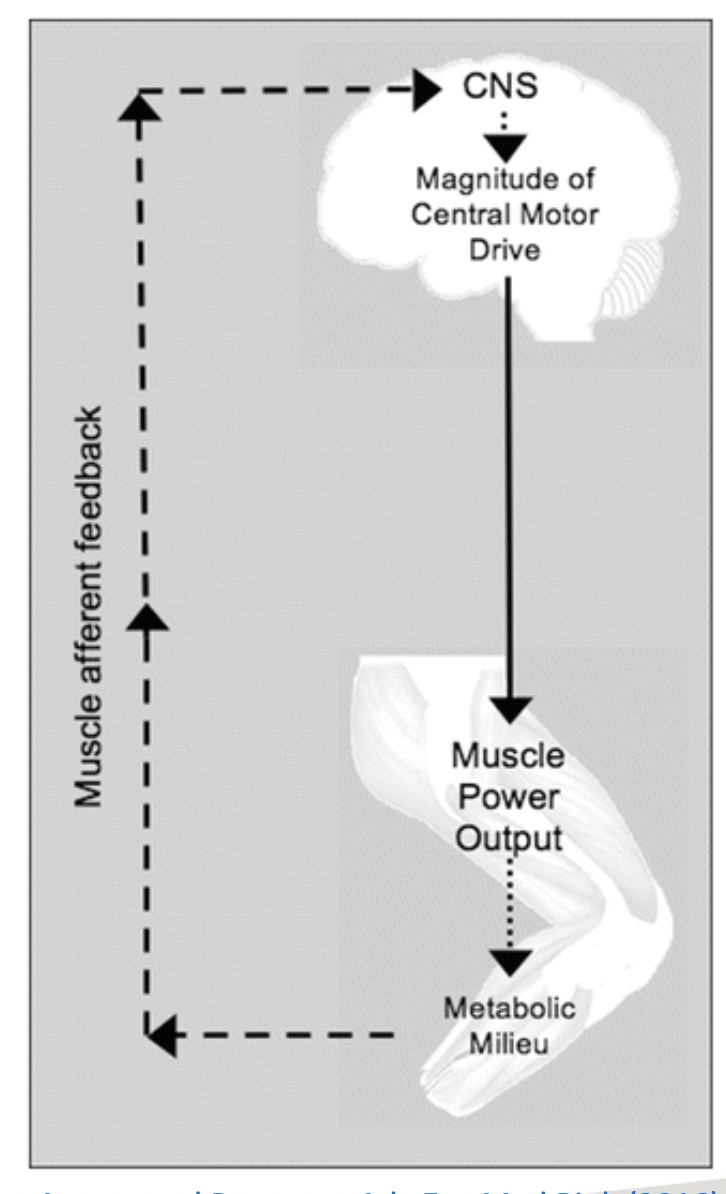 the brain sends motor drive down to muscles to contract them, the muscle contracts and Metabolites buildup, like K+ or Lactic Acid