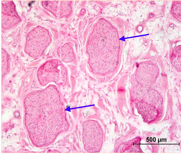 Q13. The photomicrograph below shows a number of nerve fascicles. Each fascicle is surrounded by a connective tissue sheath, indicated by the blue arrows. What is the connective tissue sheath called?