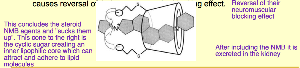 Sugammadex is a type of cyclodextrin that is capable of binding with Rocuronium and similar steroid neuromuscular blocking agents. Cyclodextrins are circular sugar-containing compounds that form a cone with a hollow core. The steroid compounds are “included” in the hollow cone of the cyclodextrin molecule and this causes reversal of their neuromuscular blocking effect.