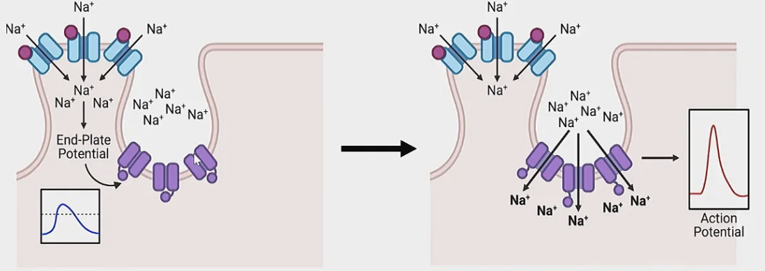 Voltage-gated Na⁺ channels open → large Na⁺ influx → muscle action potential