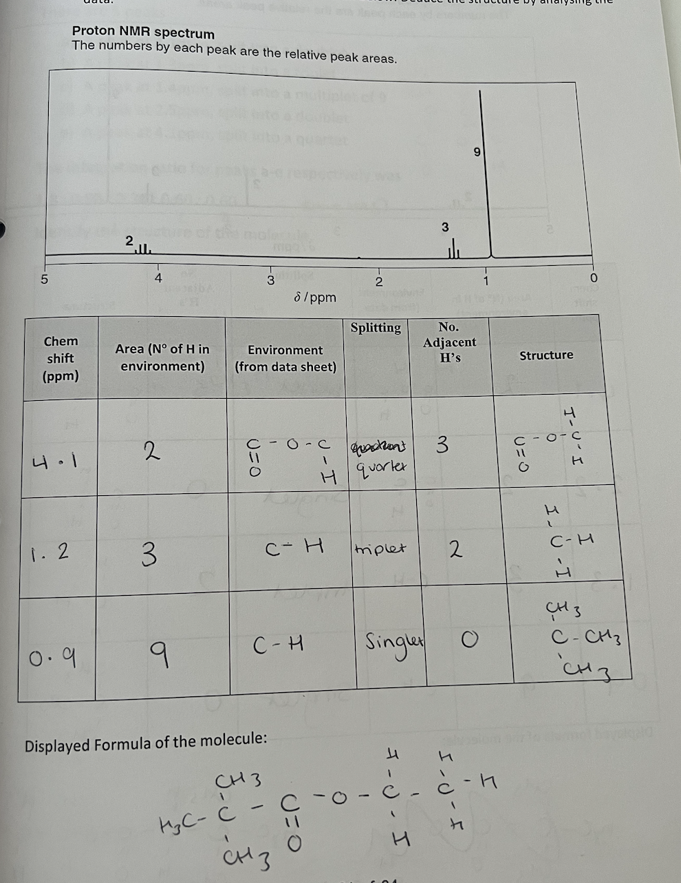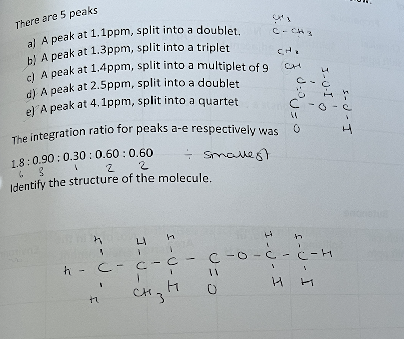 (3) Area under each peak (i.e. the integration ratio) tells you the number of protons in each environment.